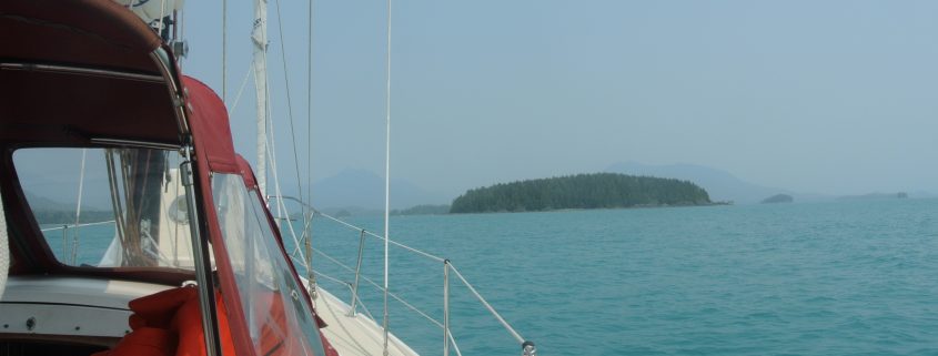 Feeling bold, our captain raised the sails and we chased the afternoon beyond the Broken Group into more distant waters. Guitar and laughter accompanied our wobbly zig-zags that were meant to resemble the neat switch-back stitches of a seasoned sailor. Taking over with our trusty sea dog on my lap, the tacks took a turn for the worse. Sudden gusts set the sails taut and my heart racing as the boat leapt forcefully ahead. Seconds later, my angles would be wrong and the gusts would blow by, leaving us like a cork bobbing in the sea. All the same, slow and steady won the race with patience as my virtue. We finally approached our moorage for the night, discovering that we would not be alone in paradise. Two other sailboats sought safe harbour in Pipestream Inlet and as we dropped anchor, we waved a friendly hello to our neighbours. Within minutes of arriving, we piled onto our trusty, tow-along skiff and set out again – there were more secrets to the coast than this quaint moorage. Looking back over my shoulder, a serene sight met my eager gaze. The soft light of the approaching dusk created a misty haze that hugged the ocean in familiarity. Within the mist sat the three boats bobbing as though patiently waiting our return. For us, the journey had just begun.